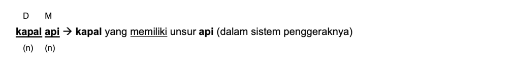 Pada frasa kapal api, api merupakan kata yang menerangkan kata kapal yang berasal dari unsur internal kapal itu sendiri. Dalam arti lain, memang benar-benar ada api di dalam kapal. Frasa lift prioritas dapat dimaknai seperti ini dengan penjelasan berikut: