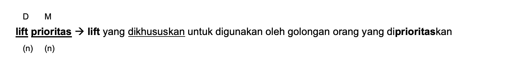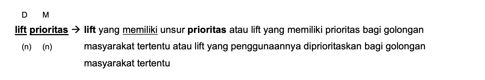 Frasa lift prioritas berpola diterangkan-menerangkan (D-M) sebab lift merupakan unsur inti atau unsur yang diterangkan, sedangkan prioritas merupakan unsur pewatas atau unsur yang menerangkan. Jika rambu aturan ini hanya menggunakan frasa lift prioritas atau tidak dalam bentuk kalimat, makna aturan ini ambigu. Frasa ini dapat dimaknai sebagaimana kita memaknai frasa kapal api atau frasa rumah sakit dengan penjelasan berikut: