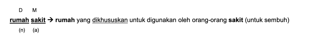 Pada frasa rumah sakit, sakit merupakan kata yang menerangkan kata rumah yang tidak berasal dari keadaan atau sifat rumah, melainkan berasal dari unsur eksternal, yaitu orang-orang. Frasa lift prioritas dapat dimaknai seperti ini dengan penjelasan berikut: